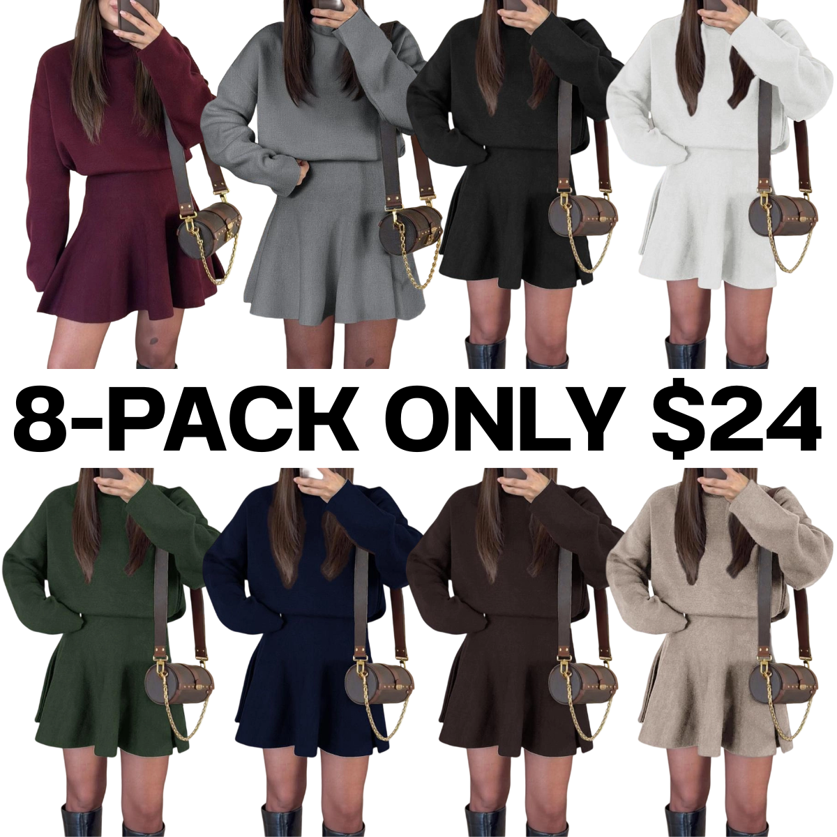 【8-Piece Complete Collection】Set includes eight knit dresses in versatile solid colors, providing elegant outfit options for your fall and winter wardrobe